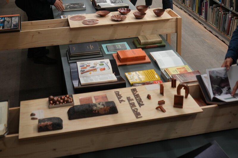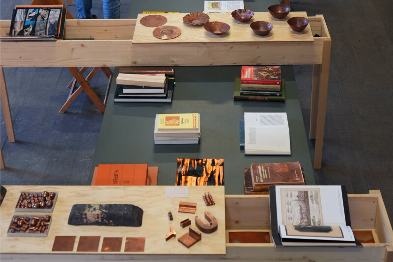Ende September widmen sich Ignacio Acosta und Stella Carlsen dem metallischen Element Kupfer und dessen Vorkommen in der Buch- und Materialsammlung. Der Künstler Ignacio Acosta setzt sich mit dem Verständnis von Orten und Landschaften auseinander, die, obwohl sie oft vernachlässigt werden, von globaler Bedeutung sind. Mit seiner Arbeit «Copper Geographies» hat er beispielsweise die Handelswege und den Lebenszyklus von Kupfer verfolgt und dokumentierte mit verschiedenen Medien die transformierten Landschaften der Atacama Wüste von Chile, wo das Material abgebaut wird, und die Londoner Innenstadt, wo es verbaut wird. Stella Carlsen ist in der Kunstgiesserei St.Gallen für das Thema der nachhaltigen Unternehmensführung verantwortlich und beschäftigt sich unter anderem mit den Fragen zur Herkunft und Gewinnung der verwendeten Materialien, die teilweise auch in der Sammlung des Werkstoffarchivs zu finden sind. Sie ist zusammen mit Ignacio Acosta eingeladen, die in Büchern und Materialschubladen vorhandenen Kupfer-Elemente statt im Periodensystem, in einem weiter gefassten Zusammenhang zu verorten und mit den Themen der Kunstproduktion in Beziehung zu setzen.