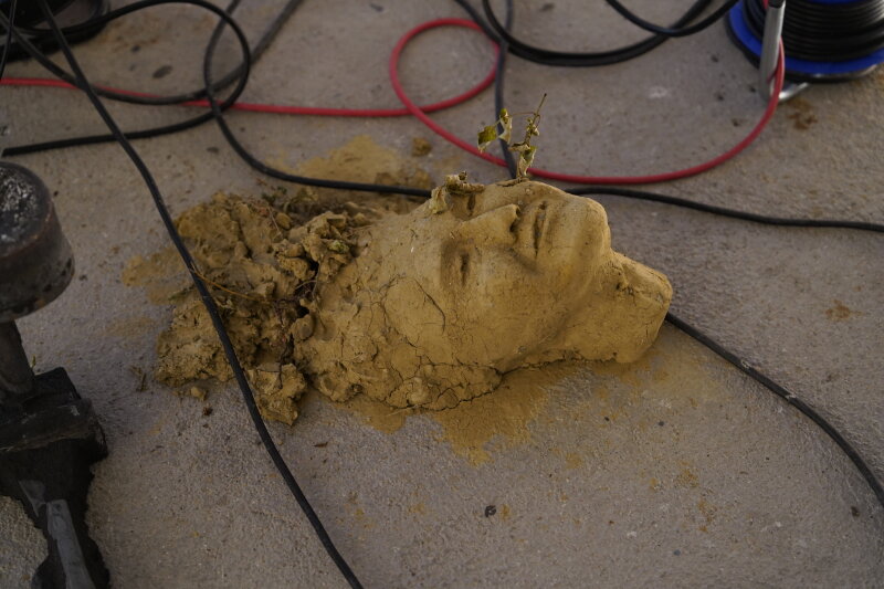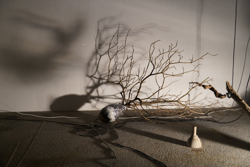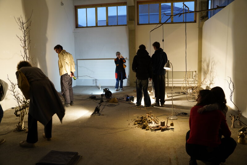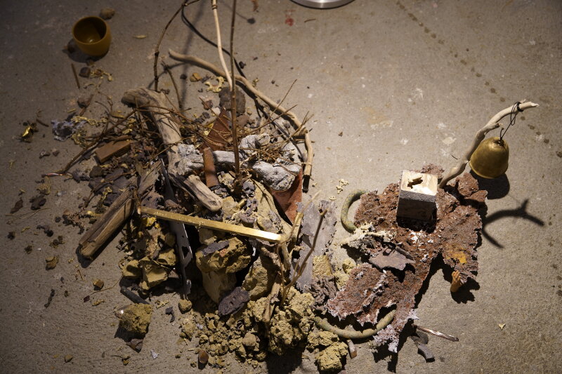 – Ich komme mir schnell riesig vor inmitten all der kleinen Details, wie der Elefant im Porzellanladen und beginne mich leise und vorsichtig zu bewegen. Und sehr aufmerksam, wenn ich nicht genau weiss, woher ein dumpfer Ton oder ein einzelnes Glöckchenklirren erklingen. Es sind winzige Fäustchen und Füsse, glänzende Reste von Gussstücken, hier gebliebene Kunstwerke, geschwungene Äste zum Teil mit trockenem Laub, kleine Motörchen, die Bewegung erzeugen und ganz viele Töpfchen in unterschiedlichen Grössen, gefertigt aus Lehm vom Areal. –
