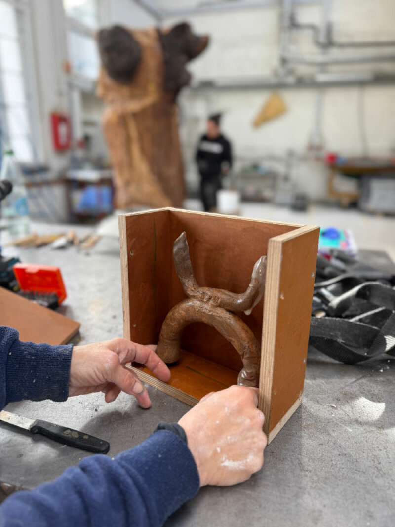 Simone Fattal (*1942 in Damaskus, lebt und arbeitet in Paris) verbindet in ihrem Werk Malerei, Keramik, Skulptur und Collage zu einer künstlerischen Sprache, die sich mit Mythologie, Identität und kultureller Erinnerung auseinandersetzt. Während eines Gastaufenthalts im Atelierhaus entstanden in der Kunstgiesserei St.Gallen Skulpturen für die Ausstellung «Voix des antiquités orientales» im Louvre, wo sie von April 2024 bis Februar 2025 im Dialog mit den Sammlungen präsentiert wurden.